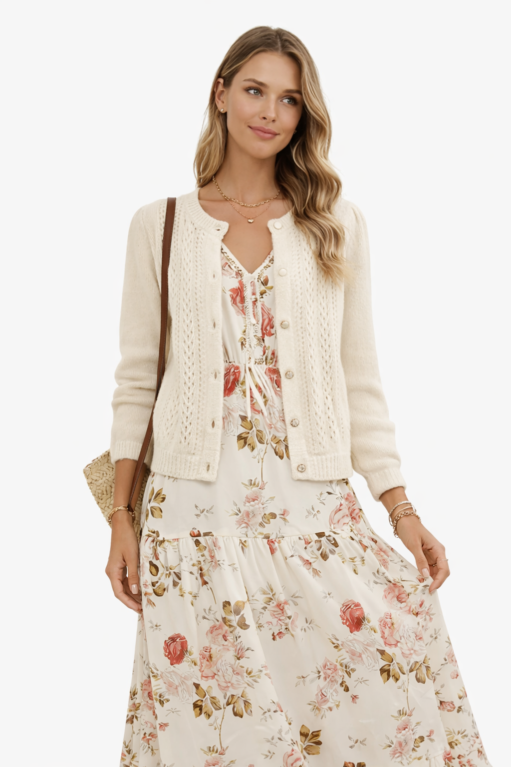 Layer the Rosalie Tiered Maxi with the Belle Pointelle Cardigan for cooler mornings and evenings. Worn open or softly buttoned, it adds warmth without bulk and keeps the look light, feminine, and effortless.
