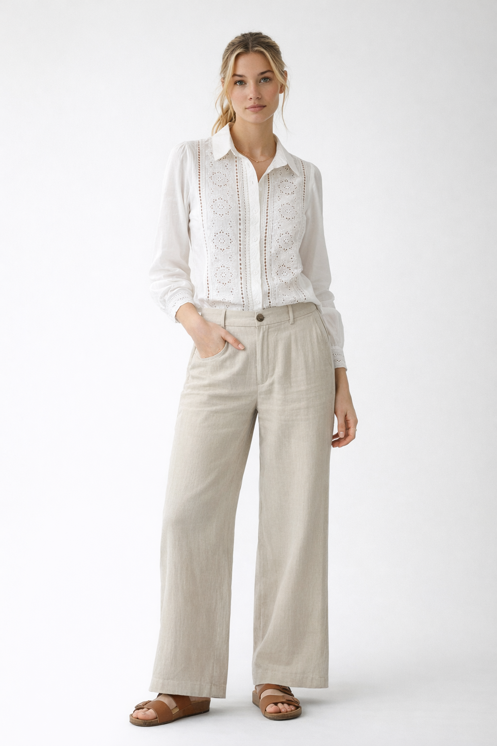 Soft tuck at the waist. Minimal gold. Leather sandals. Done.